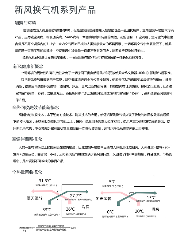 新風(fēng)換氣機又名吊頂是根據(jù)在密閉的室內(nèi)一側(cè)送風(fēng)另一側(cè)引風(fēng),則在室內(nèi)會形成“新風(fēng)流動場”的原理進行設(shè)計研制的。它依靠機械送風(fēng)、引風(fēng),強迫在系統(tǒng)內(nèi)形成新風(fēng)流動場。是一種時刻保持室內(nèi)空氣潔凈清新的新型環(huán)保電器。這種獨立的室內(nèi)空氣置換、凈化循環(huán)系統(tǒng),能在排除室內(nèi)的污染空氣的同時,輸入自然新鮮空氣,將輸入室內(nèi)的新風(fēng)先經(jīng)過濾、殺菌、加熱、增氧等多項處理。新風(fēng)換氣機是以節(jié)能、健康、環(huán)保全新概念,針對現(xiàn)代建筑空調(diào)綜合癥和耗能浪費二大難題,研制開發(fā)成功了既有回收空調(diào)系統(tǒng)中顯冷、顯熱、潛熱能量的特瑟功能,也有過濾、冷卻、加熱、加濕、凈化、送風(fēng)等常規(guī)功能的多功能機組。此機組不但可以降低運行費用、節(jié)約能源,而且,保護環(huán)境、優(yōu)化空氣品質(zhì),創(chuàng)造一個在室內(nèi)也能像沐浴在大自然中享受呼吸喜悅的理想空間,填補了暖通空調(diào)行業(yè)的空缺。新風(fēng)換氣機適用于各行各業(yè)和所有形式的同風(fēng)系統(tǒng),生產(chǎn)的新風(fēng)換氣機及新風(fēng)換氣機組等空調(diào)器產(chǎn)品有著廣闊的市場和較好的群眾口碑,知名品牌產(chǎn)品,可放心選購。